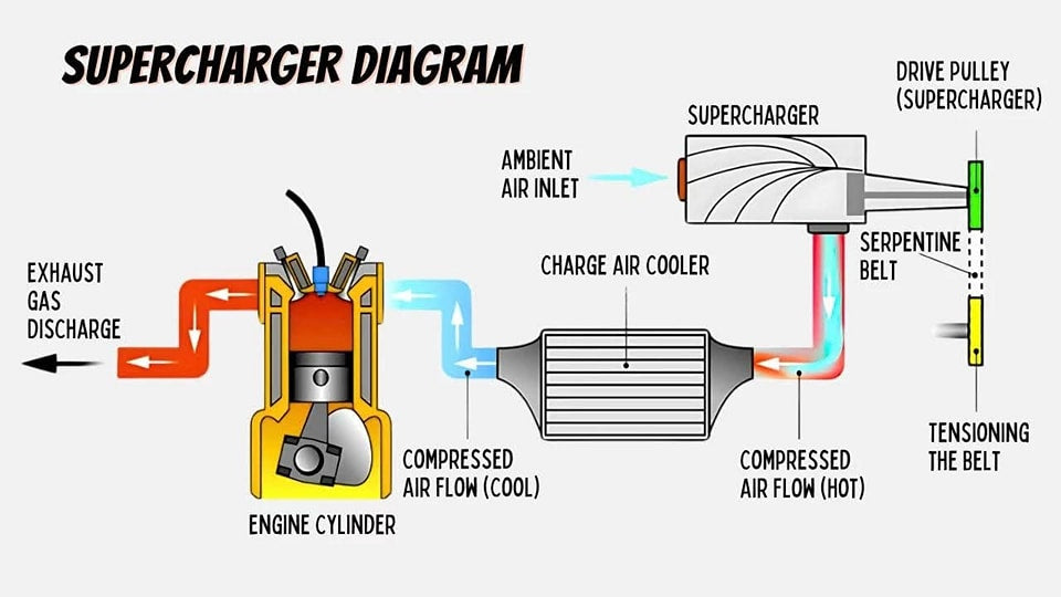 A Magnuson roots-style supercharger compresses air and forces it into the intake (arrows show “boosted” air flow). Driven by a belt connected to the crank, the supercharger pushes more oxygen into the engine, resulting in a bigger power boost.